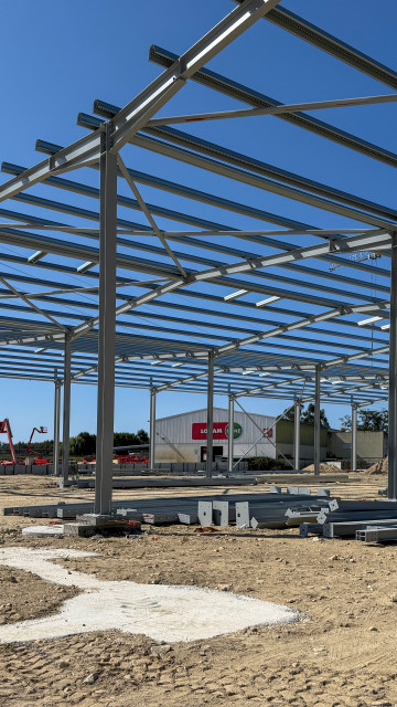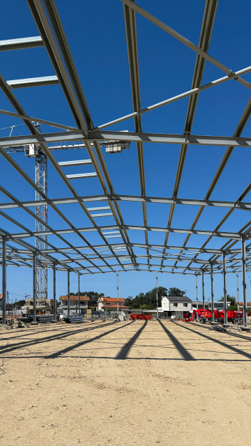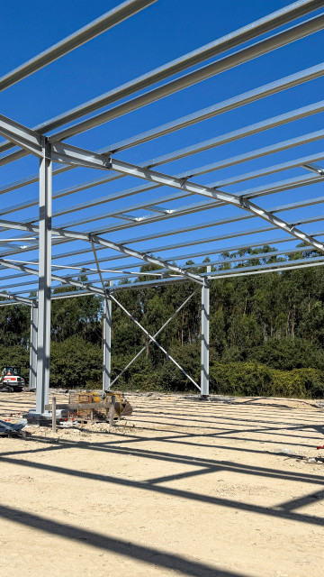 Atualmente, encontra-se em curso a execução da estrutura metálica da primeira fase da nave industrial, que contempla também a instalação de madres e caleiros.
