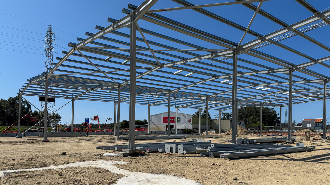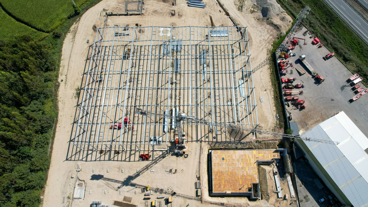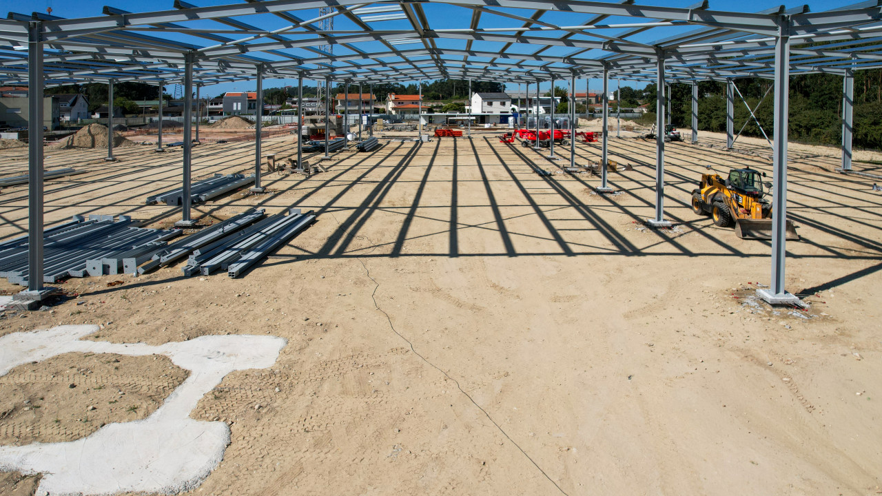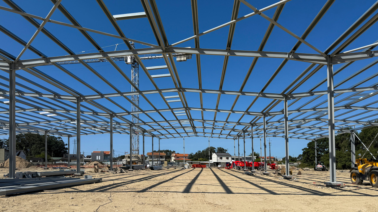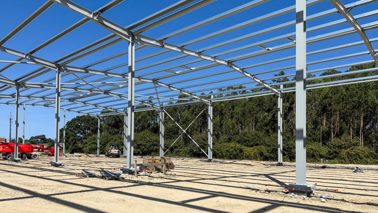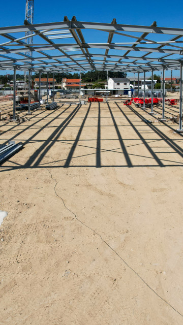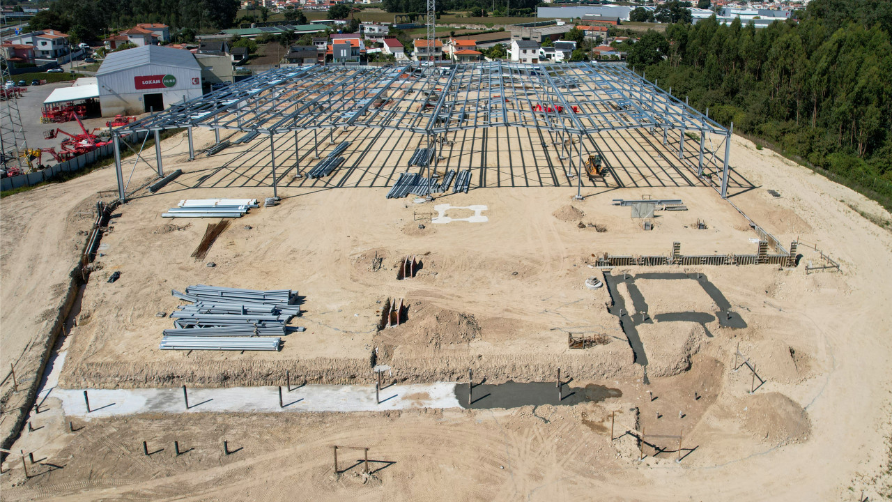 Atualmente, encontra-se em curso a execução da estrutura metálica da primeira fase da nave industrial, que inclui também a instalação de madres e caleiros.